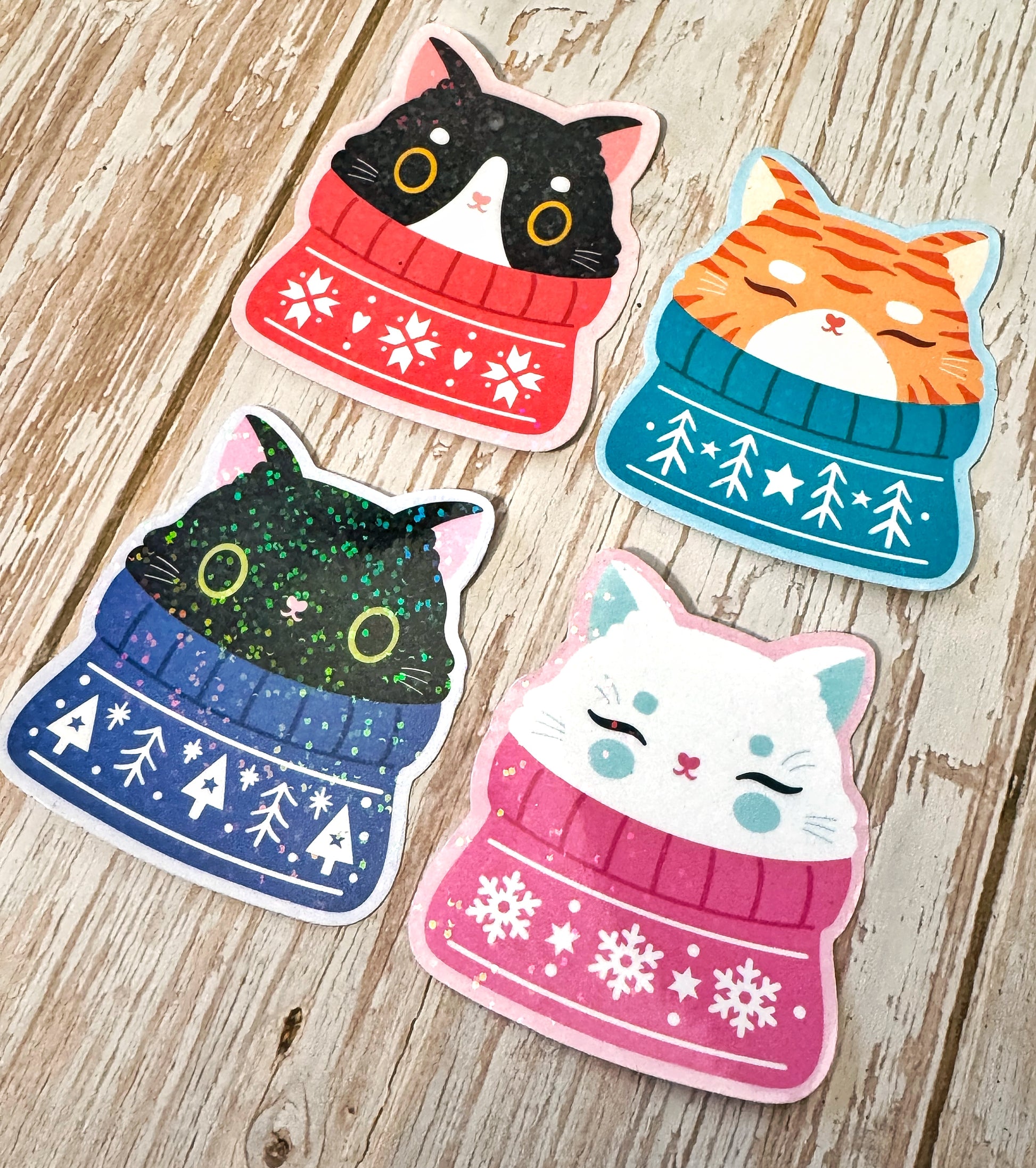 Add a touch of holiday magic to your 2025 Christmas projects with our Cozy Cats Christmas Stickers! Featuring 5 adorable cats in festive sweaters, these sparkly vinyl stickers are perfect for journals, planners, scrapbooks, laptops, water bottles, and stationery.